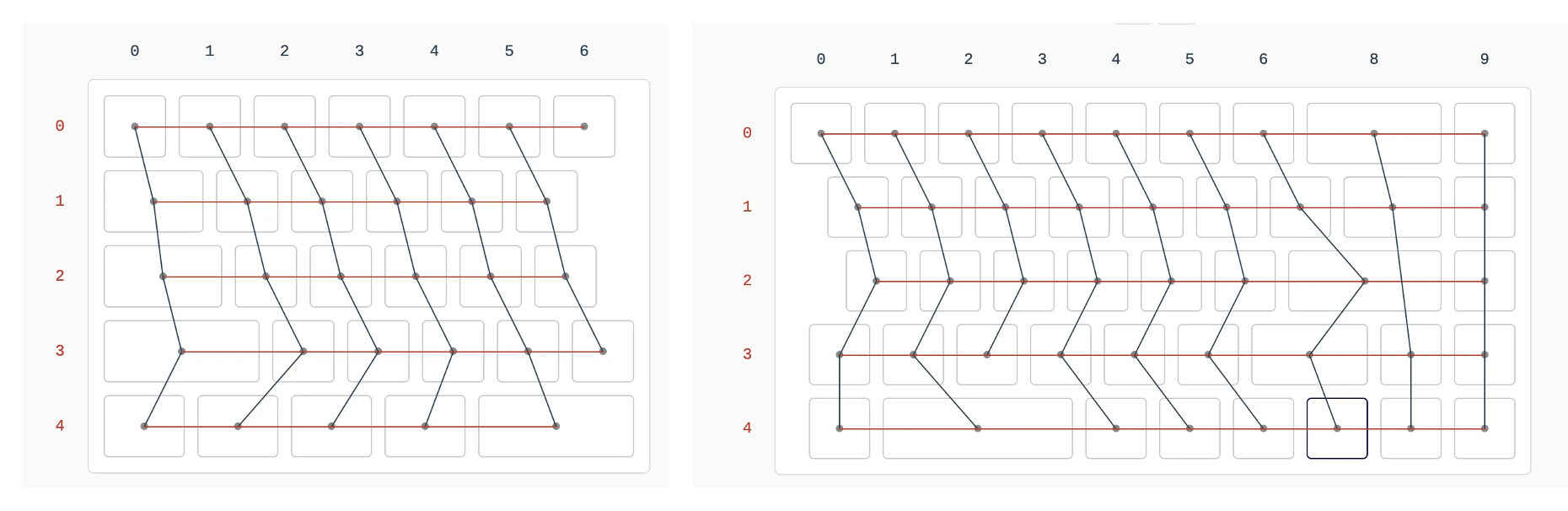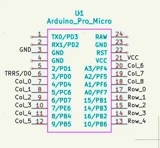 https://kbfirmware.com/ 이 사이트에 위에서 생성한 레이아웃 json 파일을 입력하면 wiring 을 수정할 수 있는데, 아래와 같이 수정하였다. 규칙이 따로 있는 건 아니고 적절하게 배선이 잘 될 수 있게 수정하면 된다. 그런 다음 이 배선대로 pcb 상에서 wiring 을 해주면 된다. 아두이노에서 어떤 pin 에 연결하는지는 레퍼런스 repo 를 참고하여 만들었다.