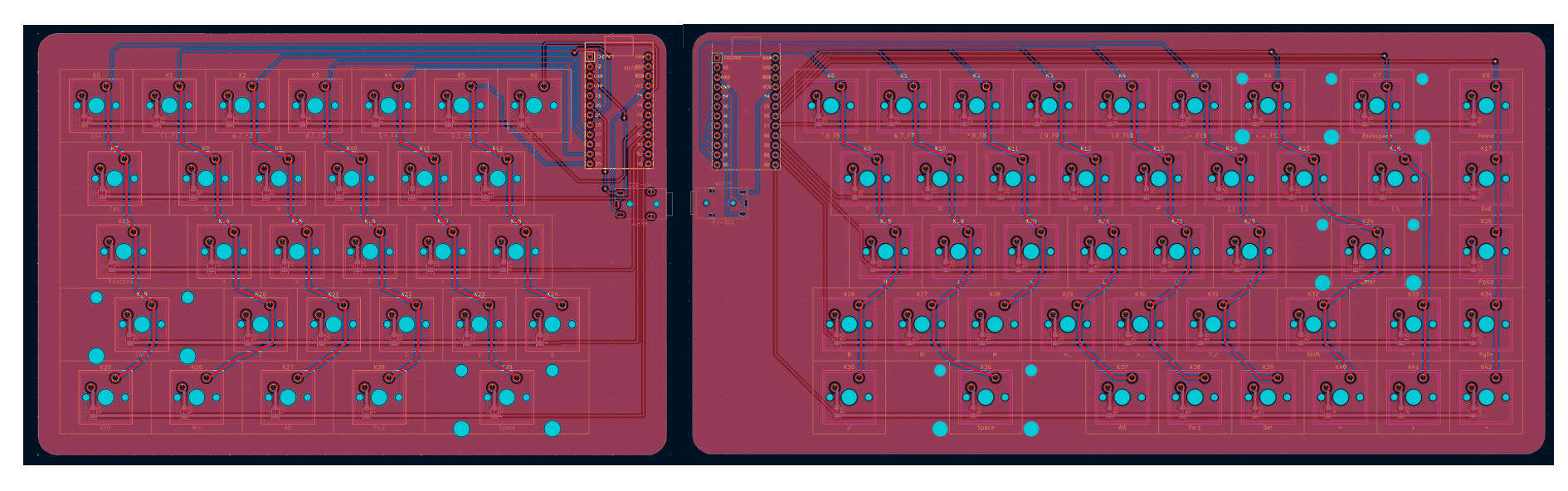 생성된 pcb 레이아웃이 완벽하지는 않아서 직접 회로를 연결해야하긴 하지만, 키보드 스위치 배치와 기본적인 간격 등이 잘 맞는 편이라 반복적인 작업을 상당히 줄일 수 있었다.