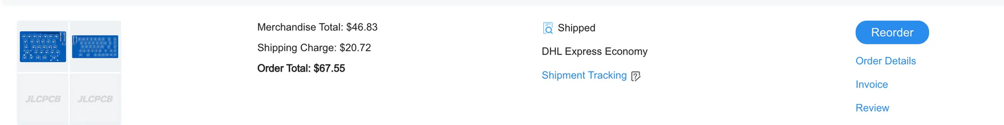 이 사이트의 가장 큰 장점은 다이오드 같은 부속을 포함해서 납땜까지 제공해 주는 옵션이 있다는 것이었다. 정확한 이름은 기억이 안나지만 ‘SMT Assembly’ 같은 옵션인데, 원래는 다이오드까지 다 따로 구매했었는데, 이걸 다 납땜하려고 했으면 납땜해야 하는 양이 거의 2배가 되는 셈이라 ChatGPT에게 물어가며 해당 옵션을 활용했다. 다이오드는 극성이 있다보니 이게 너무 헷갈려서 몇 차례 확인하고 주문했던 기억이 난다. 최소 주문 갯수가 5장이라서 왼쪽 오른쪽 각각 5장씩 주문하였는데 대략 10만원 안쪽으로 나왔다.