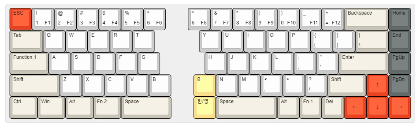 그리고 아이러니하게도, 처음 이 프로젝트를 시작할 때는 내가 괴랄한 레이아웃의 스플릿 키보드를 사용하지 않을 것이라고 생각하고 b 키가 포함된, 일반적인 키보드 레이아웃과 가까운 키보드를 만들고 싶었던 것인데, 그 사이에 나는 Keyboardio 의 Model 100 이라는 제품을 당근에서 꽤 저렴하게 구입하게 되었고, 어느덧 적응도 하게 되어서 이 프로젝트가 완성되어도 실 사용은 완성도 높은 이 제품을 사용하게 될것 같다.